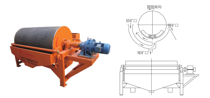 CTB型半逆流湿式精选机适用于湿式选别矿石粒度为0.5mm以下强磁性物料的扫选和精选,尤其适用于粒度为0.15~0mm矿物的精选。或者除去非磁性矿物中混杂的强磁性矿物。CTB型半逆流湿式精选机可以获得高质量的铁精矿,同时也能得到较好的回收率,所以半逆流精选机在生产实践中得到广泛的应用。本机可以连续给矿和排矿,磁场强度大,磁场梯度高,具有较高的处理能力。可以多台串联和并联,实现多次的扫选和精选。二、示意图