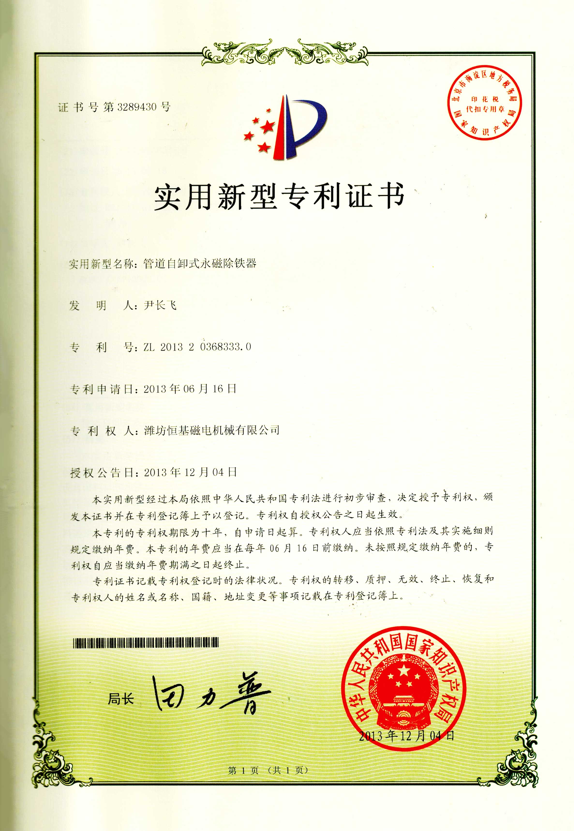 • 3实用新型专利证书-管道自卸式永磁除铁器