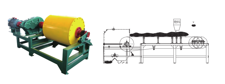 CTDG型永磁大块干式磁选机是一种新型高效能的节能选矿设备。除现有定型产品外,还可根据用户特定要求设计制作成不同磁感应强度,适用于不同皮带规格的磁选机(磁滑轮)。产品广泛用于冶金和其他行业,可满足大、中、小矿山选厂需求;用户磁选厂碎矿后各段预选作业,抛除混入的废石,恢复地质品位,可节省能耗,提高选厂处理量;用于采场,从废石中回收磁铁矿石,提高矿石资源利用率;用于从钢渣中回收金属铁;用于垃圾处理分拣有用金二、示意图
